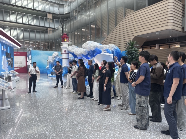 在新闻中心副编审冯文波老师的生动讲解下,剧组成员深入了解了文圣常院士作为我国海浪研究的开拓者和物理海洋学奠基人的光辉事迹与崇高精神。展览通过光山少年、逐梦向海、耕海踏浪、精神灯塔四大篇章,以500余件科技史料和丰富互动展品,全面呈现了文先生崇德守朴、浩海求索的感人一生。